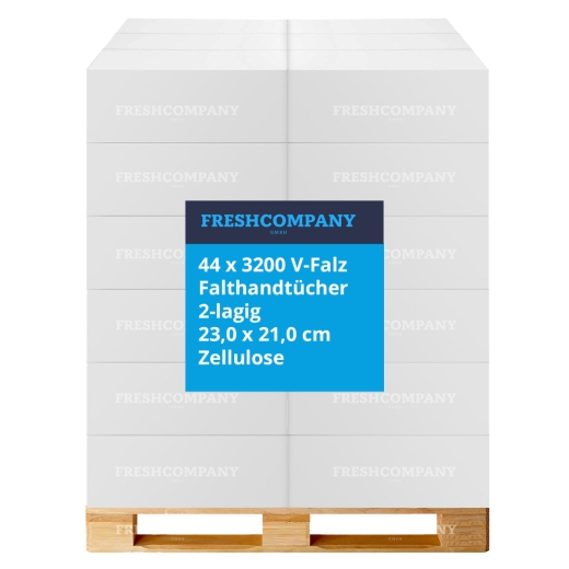 Sie erhalten bei diesem Angebot 44 Verpackungseinheiten mit je 3200 Blatt Falthandtücher auf einer Palette. Lieferung nur innerhalb Deutschlands, keine Insellieferung!
